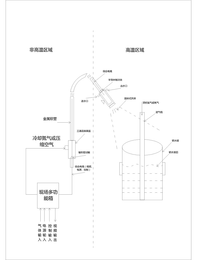 公司自主研發(fā)生產(chǎn)的轉(zhuǎn)爐爐口高溫針孔防濺除塵監(jiān)控系統(tǒng)主要是在轉(zhuǎn)爐狗窩處的側(cè)面外層圍板處開(kāi)孔,將鏡頭伸入。采用微氣量保護(hù)方式, 集視頻技術(shù)、機(jī)電控制技術(shù)及傳感技術(shù)為一體的特種監(jiān)控成像技術(shù),將煉鋼時(shí)轉(zhuǎn)爐內(nèi)化學(xué)反應(yīng)的狀況顯現(xiàn)在操作人員面前。